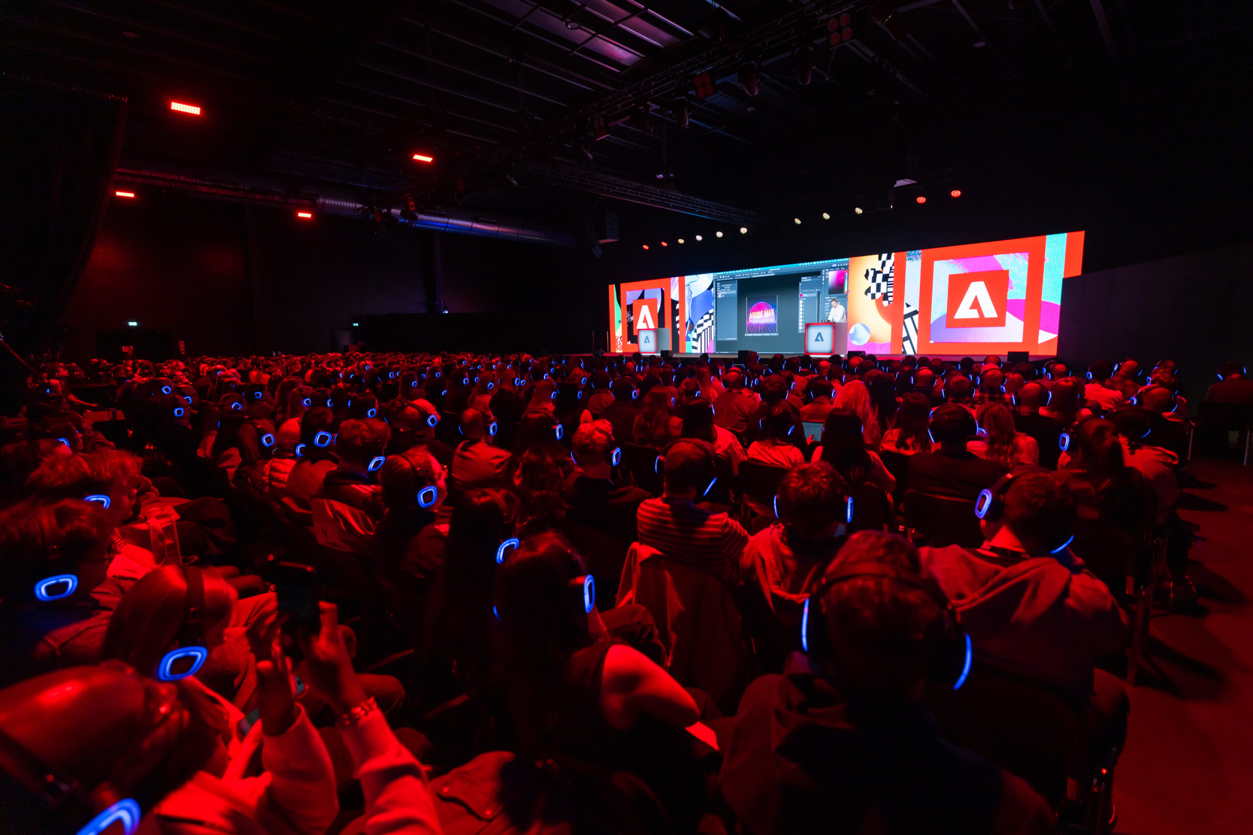 Beyond the keynote space, the venue was transformed into four silent breakout rooms using wireless conference headsets, each fully equipped with audio, lighting, and display systems. In the networking zone, guests experienced a bespoke activation beneath the iconic scenic Adobe Lens, supported by extended technical infrastructure across multiple product demonstration areas.