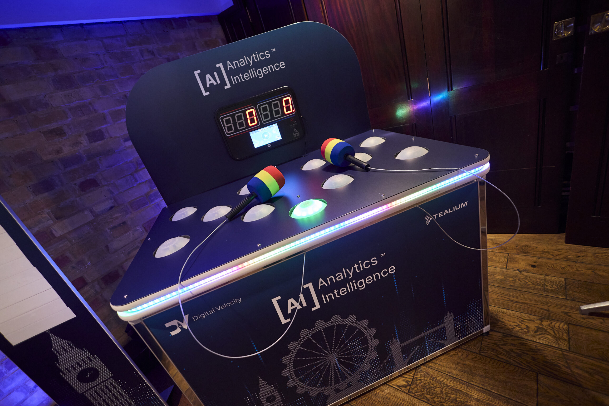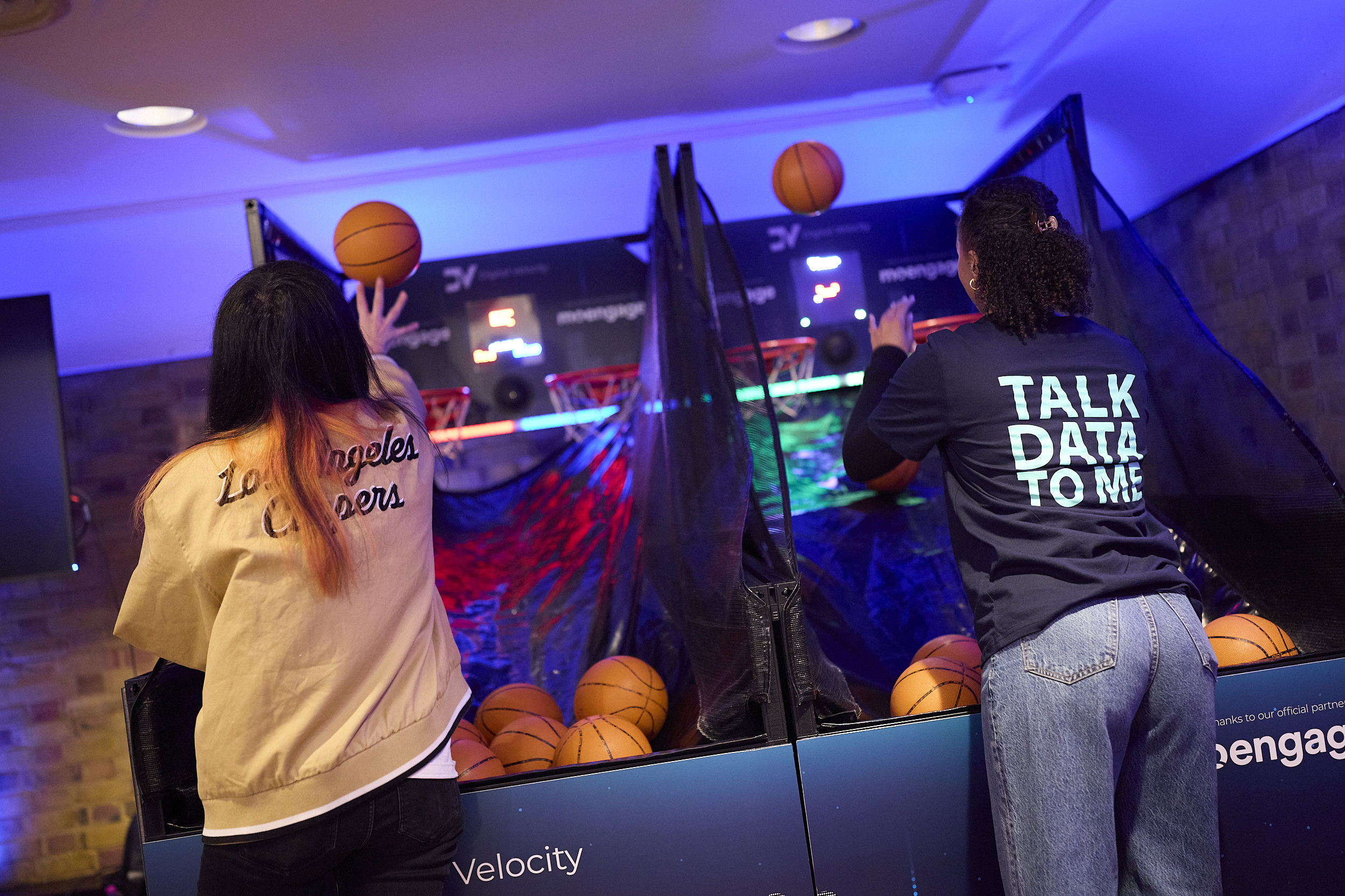 Activations were expanded to feature a branded swag store in the outdoor marquee, showcasing merchandise that reflected the Tealium “beast” and AI themes to create memorable take-home experiences. Additional interactive elements, such as a custom “whack-a-mole” installation and a branded basketball challenge, were integrated throughout the venue to maximise engagement. Venue branding further immersed attendees in the Digital Velocity identity through lightbox artwork, large-scale signage, floor graphics, themed food stations, branded coffee cups, a customised Guinness bar, and appearances from Tealium’s ‘’Beast’’ mascot in digital content and activation spaces.