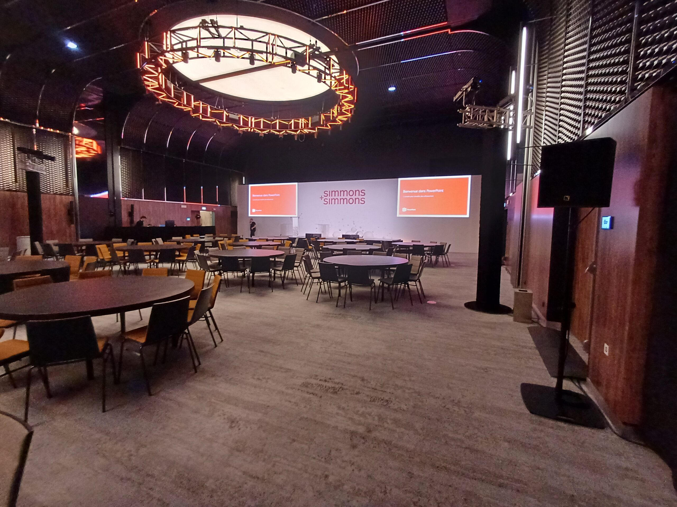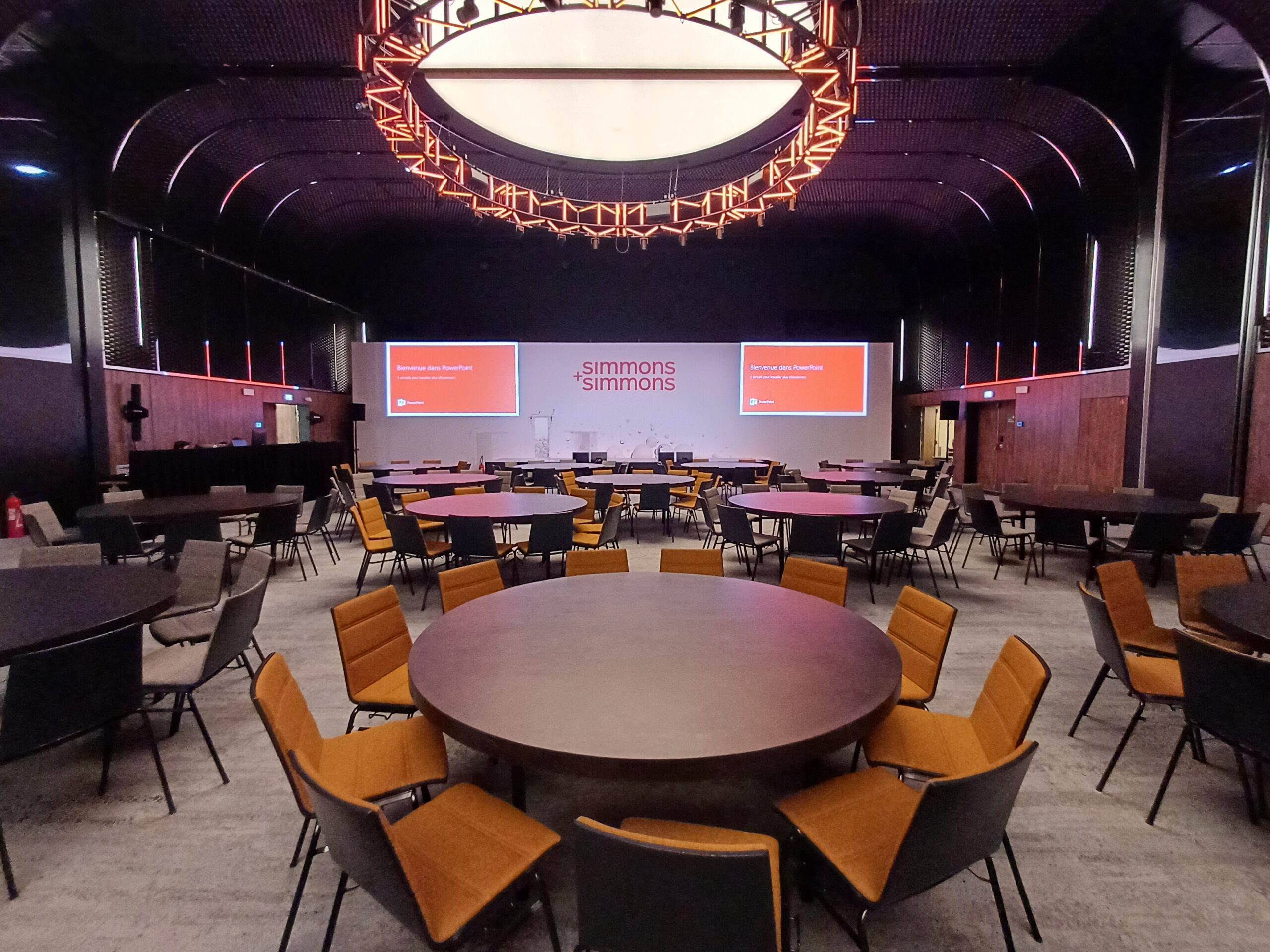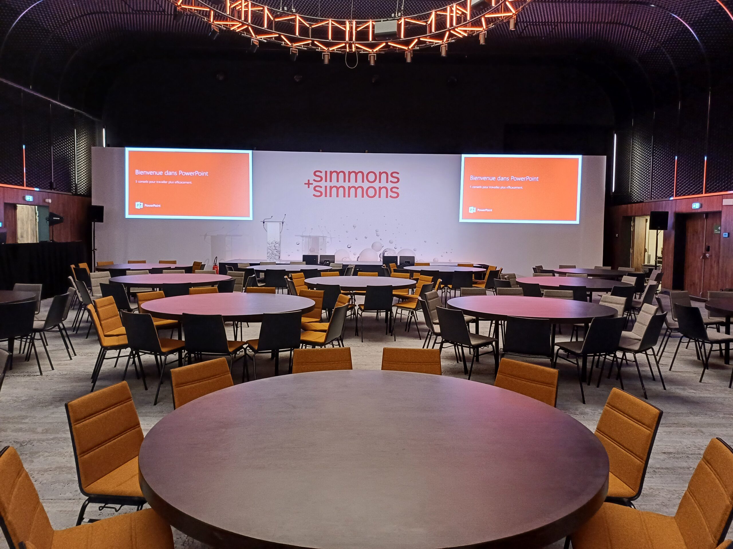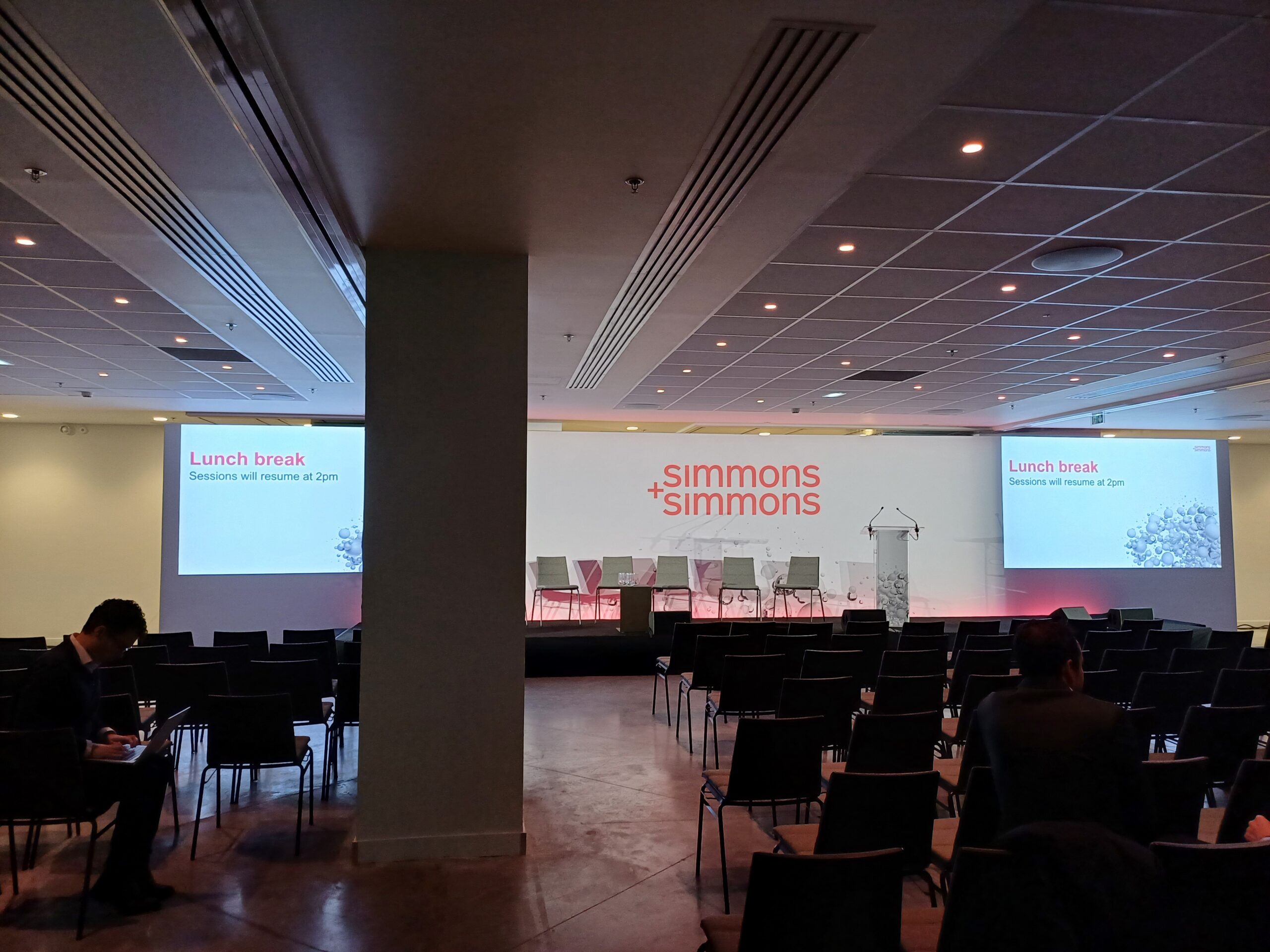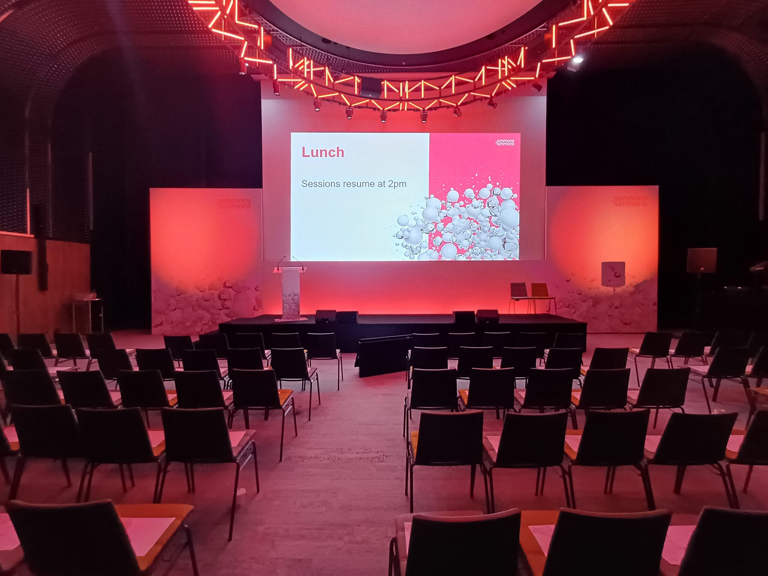We worked closely with Simmons & Simmons team to develop an efficient and well-coordinated production plan. Following a detailed site inspection and multiple planning meetings, we refined the technical layouts within the designated ballrooms, focusing on proven configurations while optimising flow, capacity, and delegate experience.