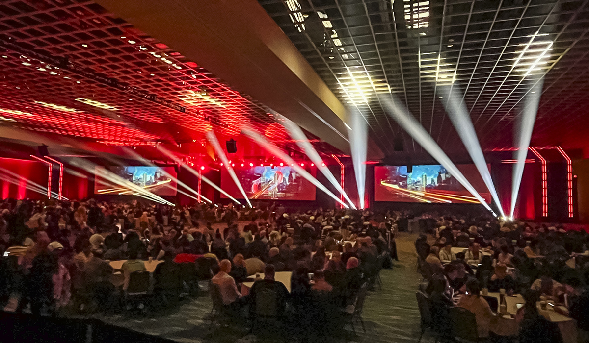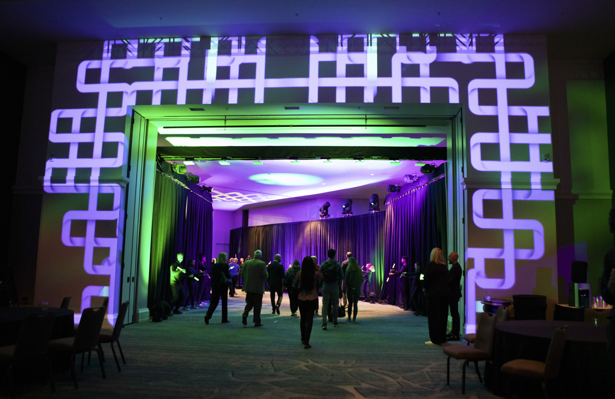 Lighting is most effective when you use it to enhance scenic elements to create texture, depth and theatrical flair. For example, change the dynamic in the room by changing the gobo pattern throughout the day. Or amp up the energy by using a combination of gobos, LED moving lights and LED strip lights with a programmed controller to adjust speed and colors any time you want to shift the mood or delineate a change in program. This technique changes the look of a space without physically rearranging anything.